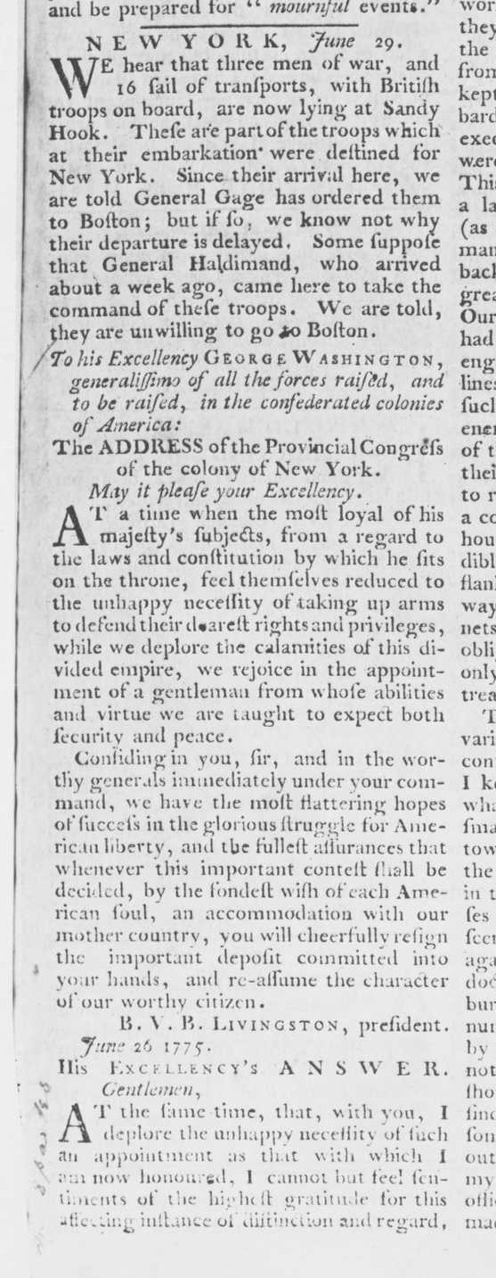 Three weeks before this declaration, the Continental Congress appointed George Washington as commander in chief for the provincial armies. On a June 15th motion from John Adams, Congress unanimously appointed Washington to “command all the continental forces.” It was a decisive step, “an act second in importance only to the Declaration of Independence the following year.” Washington accepted “in a speech of simplicity and modesty.” He refused any compensation beyond his expenses. [The Spirit of ‘Seventy-Six (edited by Henry Steele Commager and Richard B. Morris, Castle Books 2002, pages 138, 140]. In its July 14, 1775 issue (page 3), The Virginia Gazette published correspondence between the New York Provincial Congress and General Washington. The New Yorkers congratulated the general on his appointment but expected him to return to private life after the war was won. Washington wrote that he was planning to do just that after the “establishment of American liberty, on the most firm and solid foundations”. Peter Van Brugh Livingston “was a delegate to the New York Provincial Congresses, and was President from May 1775 to August 1775 and from September 1776 to March 1777.”