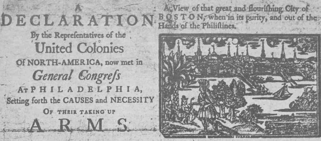 A DECLARATION By the Representatives of the United Colonies Of NORTH-AMERICA, now met in General Congress AT PHILADELPHIA, Setting forth the CAUSES and NECESSITY Of their taking up ARMS.
