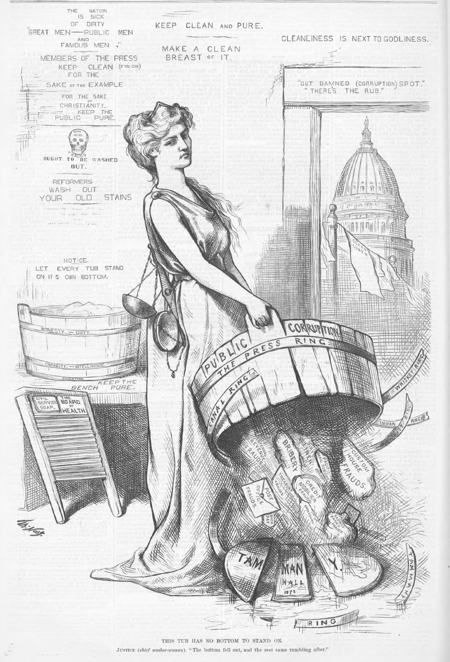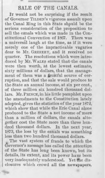In 1871 as chairman of the New York State Democratic Committee, Samuel Tilden investigated the Tweed Ring corruption and won election to the state assembly as an anti-Tammany Democrat. As governor his most notable achievement was destroying the Canal Ring:
