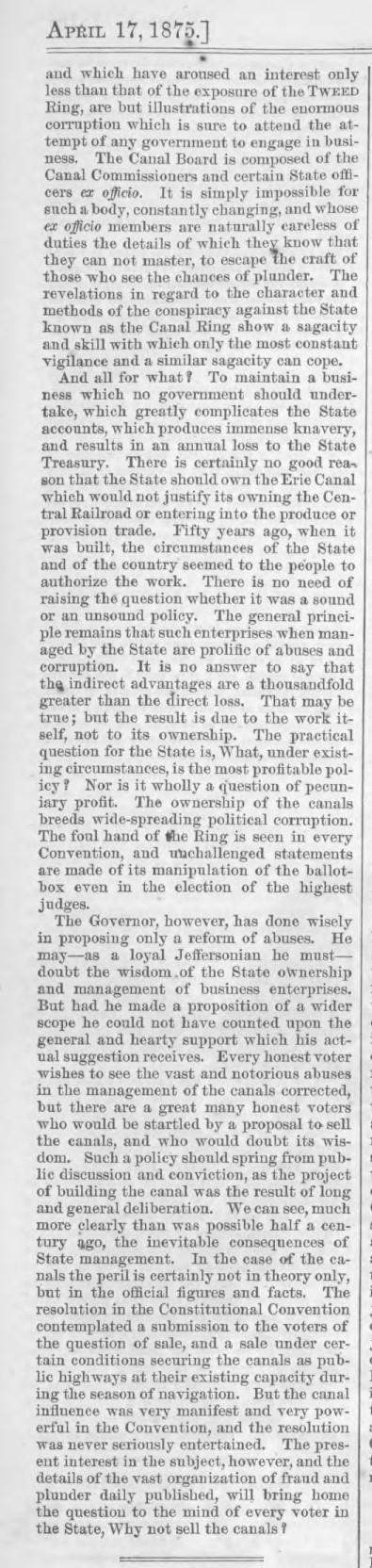 We seem to like anniversaries, counting the years with our trusty calendars. I’m pretty sure I was vainly proud to graduate from school the year of the United States bicentennial, and I know I was very enthusiastic about the Civil War sesquicentennial. 150 years ago Americans began to celebrate the U.S. centennial with commemorations at Lexington-Concord and Bunker Hill. 1875 also marked 50 years since the “Wedding of the Waters,” the official opening of the Erie Canal, but people weren’t exactly celebrating. In 1875 the New York State canal system was an example of public-private corruption. Harper’s Weekly covered New York Governor Samuel Tilden’s initiative to end the ongoing “Canal Ring” fraud. From the August 28, 1875 issue of Harper’s Weekly (page 694):