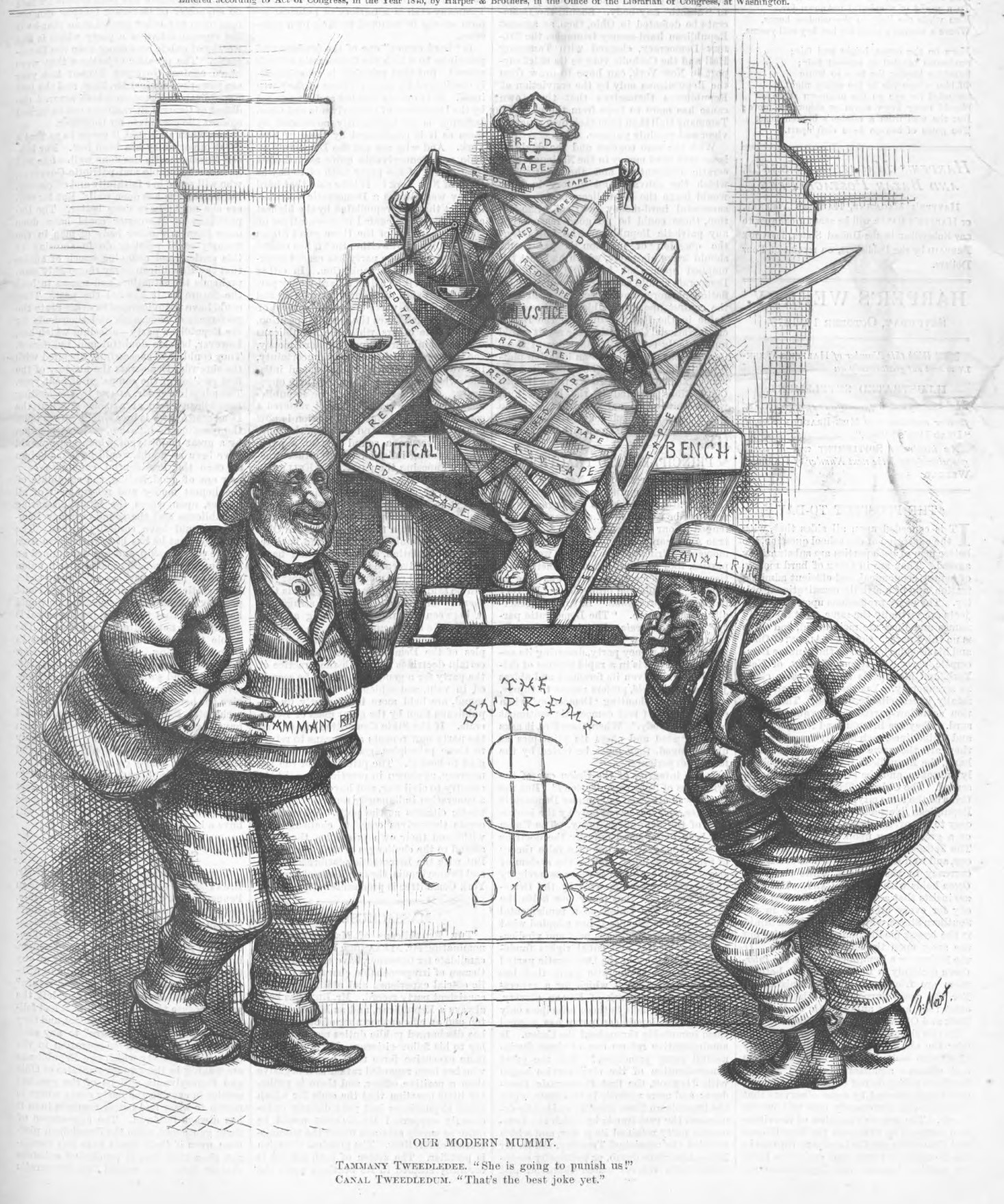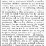 The report itself must be read to understand how in the work upon the canals every requirement of law is perverted or evaded, and how thousands of dollars are stolen from the State Treasury by means of official falsehood. If the reader should be depressed by the reflection that so important a branch of the public business is corrupt, he may be consoled by two other reflections — one, that it ought not to be the public business, for the government ought neither to own nor to manage the canals; and the other, that if the corruption is deep and systematic, the honest purpose and intelligence to expose and abolish it are not less evident. It will help the reader to some apprehension of the system and of the amount of the frauds if we state that the DENISON contract covered a space of canal repairs less than eight miles in length, and that DENISON agreed to do the work for $74,183.40, and that when it was about two thirds done he had received $491,260. This enormous sum was made up by false measurement and computation; by charging the State twice for work not done, as by pretending to make excavations that were never made, and putting back the same rock and earth as embankment, although they had not been disturbed. Fully one third of the whole amount paid by the State upon this contract, $150,337 02, is for work which has not been done. It is a sheer theft from the Treasury. The surveys, maps, and estimates which the law requires were never made. The Canal Commissioners certified that they had seen maps and plans and estimates which did not exist. The Canal Board resolved that these imaginary documents should be adopted. The contract was advertised and let without any authority having the knowledge of the work and the materials which the law requires. A large percentage of the money paid upon the contract was paid with a full knowledge that the work had not been done. Not a single yard of the work done corresponds to the specifications. No assistant has been removed or rebuked for making false measurements and estimates, or for accepting dishonest work. Yet had the laws of the State and the regulations of the Canal Board been enforced, the work could have been already done for the sum originally appropriated. The commission concludes that the false and fraudulent measures, estimates, and allowances were only possible through the culpable neglect or connivance of the Canal Commissioners, O. BASCOM and JOHN D. FAY, the engineers, and the inspectors in charge.