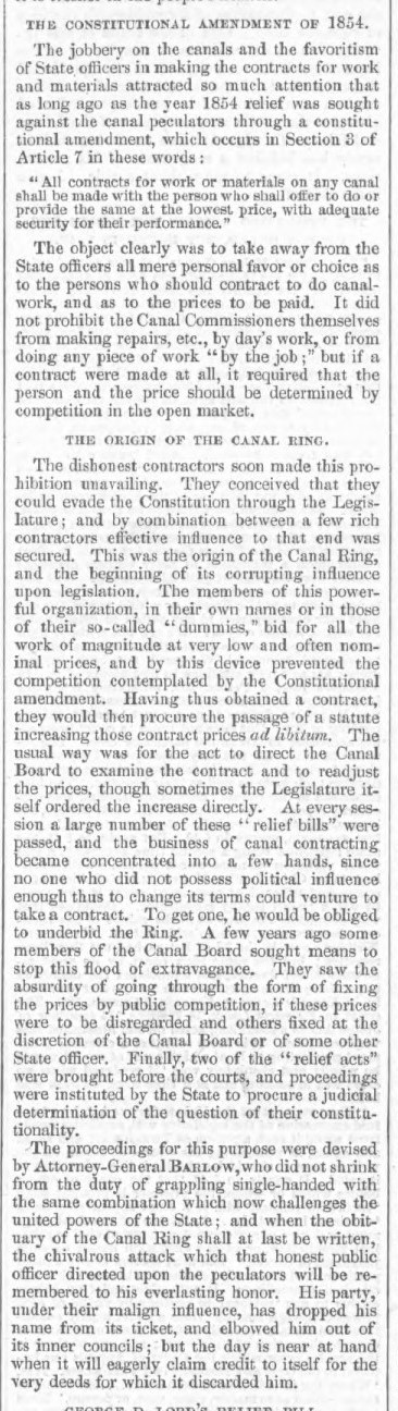 Governor Samuel Tilden made taking on the “Canal Ring” one of his administration’s major projects. Harper’s Weekly published a lot of information about the Canal Ring throughout 1875. In its April 17, 1875 issue the newspaper questioned whether the state should even be in the business of running the canals. The governor said he was not planning on selling the canals, just cleaning up the abuses. The newspaper’s November 13, 1875 Supplement explained how the Canal Ring worked – contractors undercut other bidders for a canal project, then the state legislature would direct the canal board to increase the prices paid to the contractors. Civil War veteran and New York State Attorney General (January 1, 1872 – December 31, 1873) Francis C. Barlow courageously confronted the Canal Ring. Barlow also prosecuted the Boss Tweed Ring.