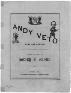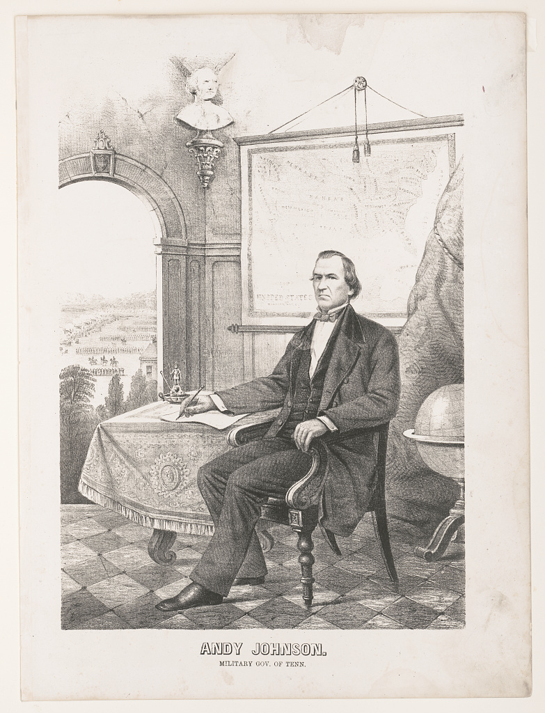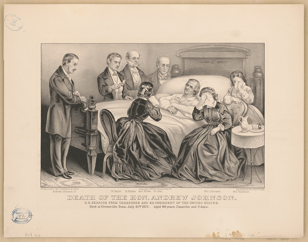 From the Wikipedia article about Andrew Johnson – the March 1875 photo; the photo the Johnson’s monument is from the National Park Service. From the Library of Congress: 1865 photo of the Johnson tailor shop in Greenville, Tennessee; Andy Veto sheet music from 1866; military governor; Currier & Ives’ 1875 portrayal of Andrew Johnson’s death.